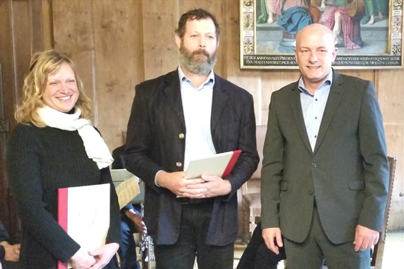 Oberbürgermeister Joachim Wohlbergs ehrt den Biobetrieb Graf und den Landschaftspflegeverband Regensburg e.V. mit dem Umweltpreis der Stadt Regensburg mit einer Anerkennungsurkunde für das Juradistl Projekt Beweidung Winzerer Höhen.
